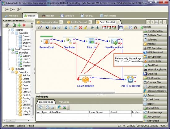The left panel located in the Design tab enables you to connect to whatever repository you want, then handle any kind of database be it Oracle, Microsoft Access, SQL Server, MySQL, PostgreSQL or Excel spreadsheets. The program provides a mechanism by which a number of different systems and protocols can interact in order to help you process a number of tasks from start to finish. It can handle a number of different functions and services such as processing databases, e-mail protocols and Office documents.